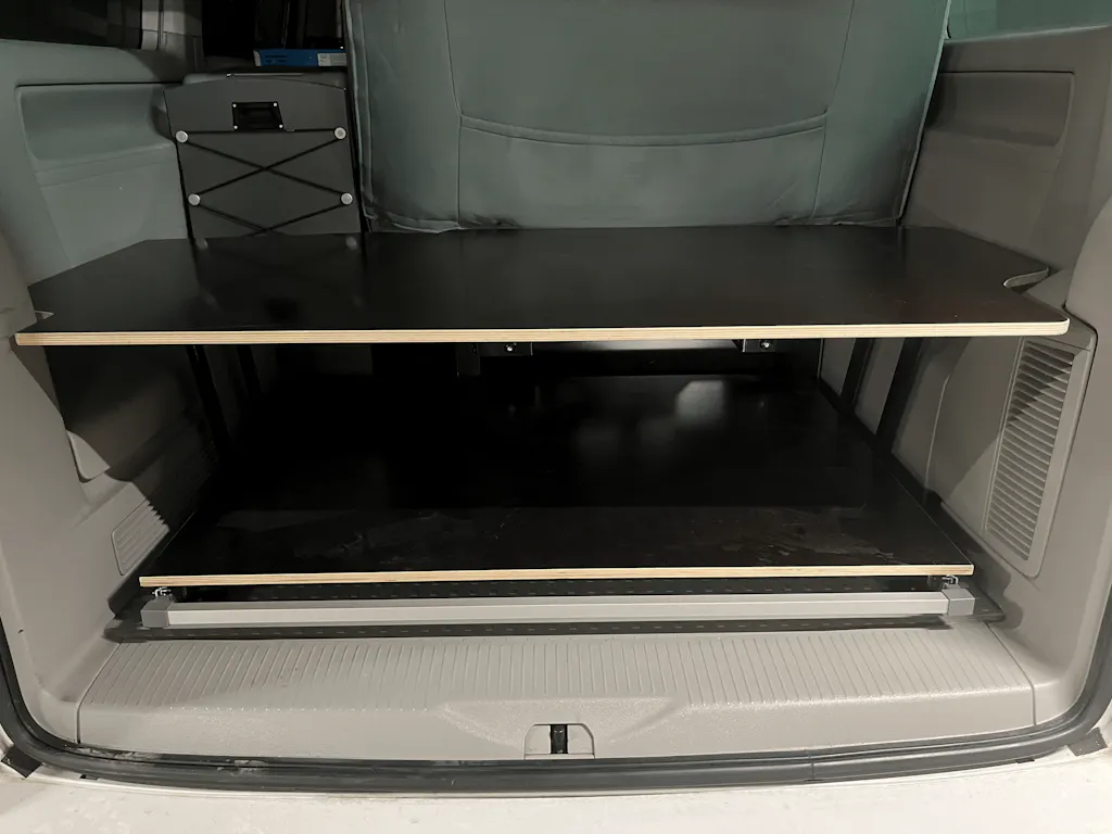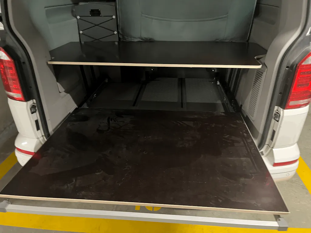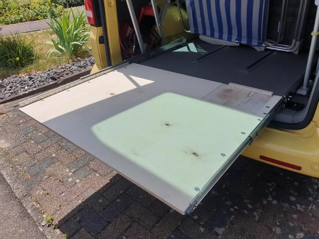 Vorne weg, hat alles super geklappt und der Support war hervorragend. Entgegen des Beschriebs kann das ganze Einbauset auch für einen VW Beach mit Zweiersitzbank verwendet werden! Der Einbau war sehr einfach und passgenau zu den Multislide-Schienen die man ja separat bestellen muss. Ich habe die Auszugsplatt oben platziert damit ich den Platz bis zu den Multiflexboard-Füssen nutzen kann. Zwischen dem Fahrzeugboden und der Unterkante hat man so noch ca. 6cm Staufläche zb. für eine Faltsolarpanel oder Klapphocker