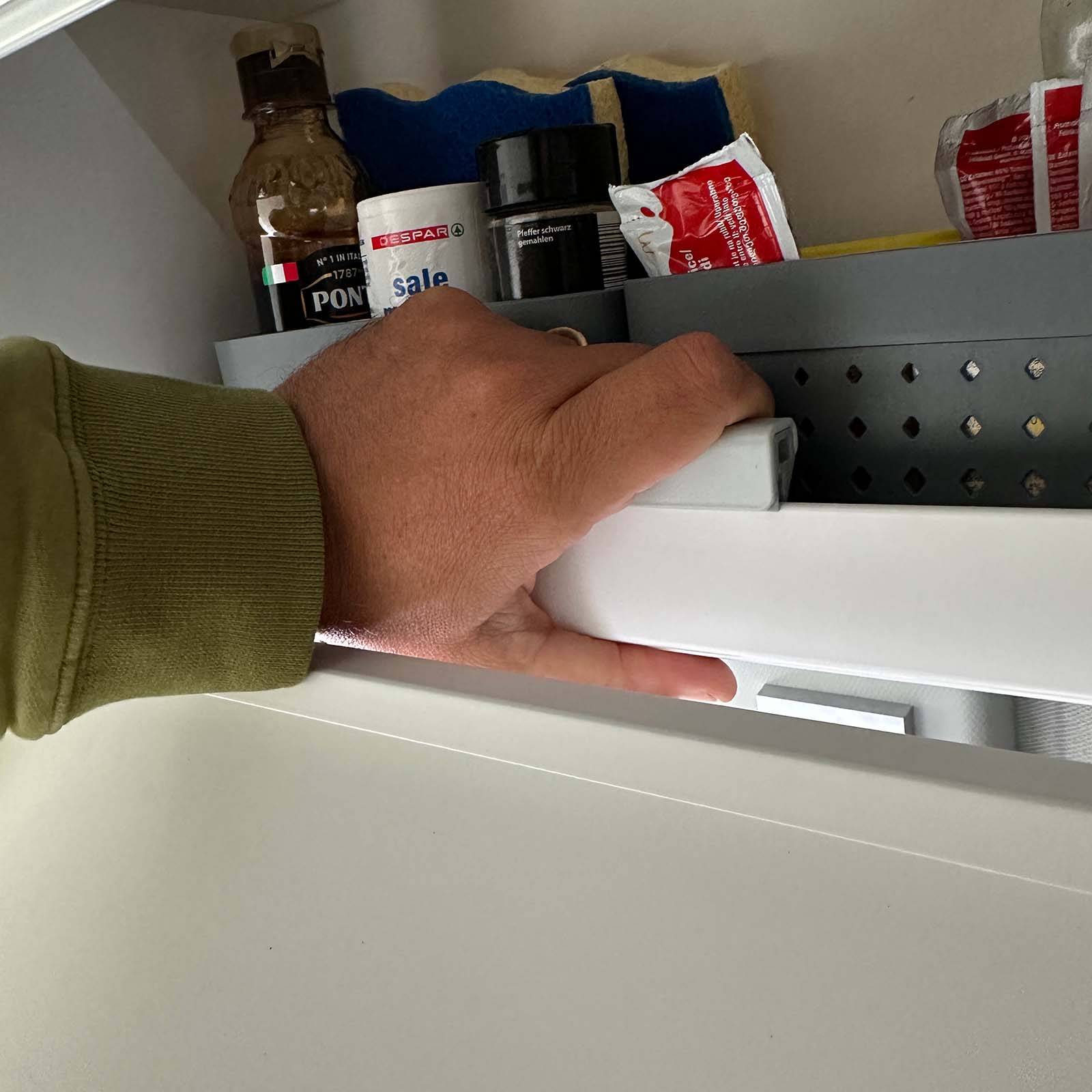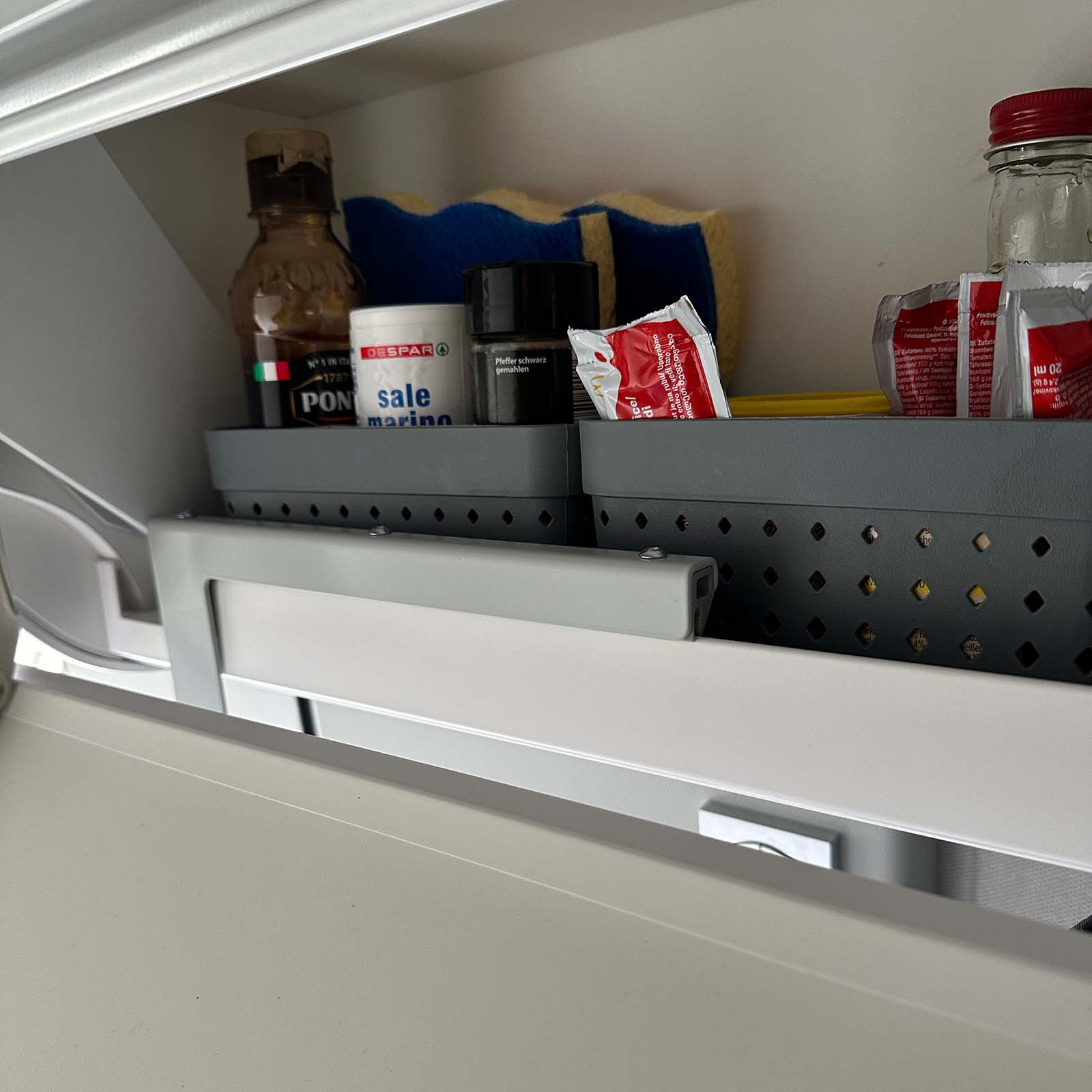 Das Beste daran: Für die Montage sind weder Bohren noch Kleben notwendig! Der Halter wird einfach und sicher eingeclipst, sodass du das Staufach weiterhin nutzen und die Klappe problemlos öffnen kannst. Eine clevere Lösung, um deine Küche im Grand California noch funktionaler zu gestalten.