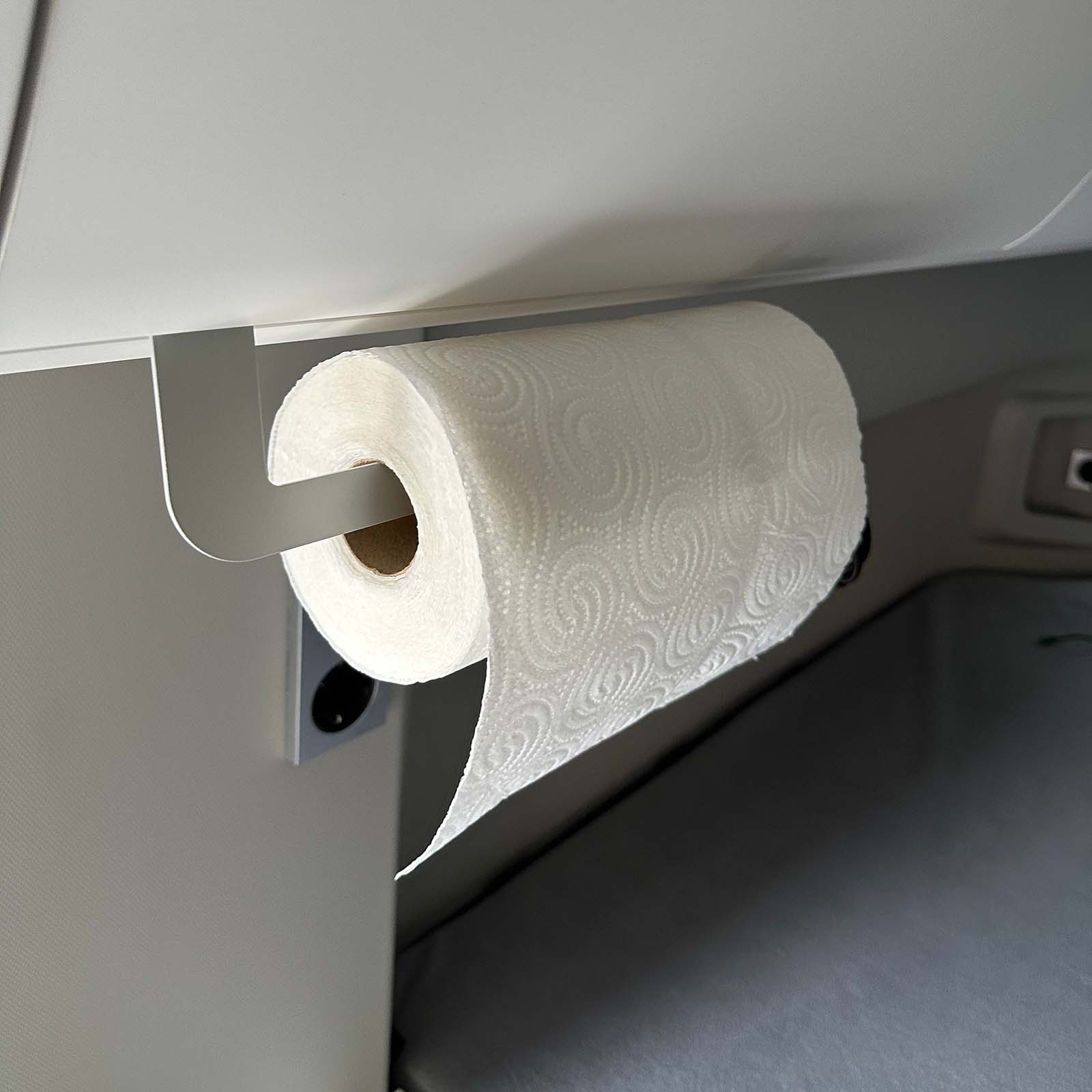 Auf Reisen im VW Grand California ist Stauraum ein kostbares Gut – besonders in der Küche, wo oft nur wenig Ablagefläche zur Verfügung steht. Ein unverzichtbares Gadget für jede Reise ist die Küchenrolle. Damit sie ihren festen Platz bekommt, haben wir einen praktischen Küchenrollenhalter entwickelt, der sich perfekt an den Hochschränken des VW Grand California befestigen lässt.